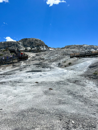 This is a nice little trail to admire the mineral formations that forms the terraces of Mammoth Hot Springs. Its white color on the rock definitely stands out with small springs found around the area. The trail is on a boardwalk and does have a significant amount of steep steps so come prepared for steps and an incline. Beautiful views of the hills and mountains once at the top. Crowded area but worth the crowds. It is about an hour or so away from West Yellowstone.